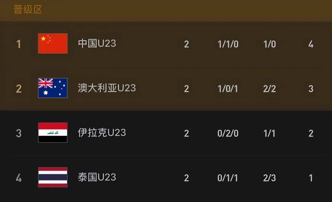目前D组2轮战罢,U23国足4分领跑,澳大利亚队3分第2,伊拉克队2分第3,泰国队1分第4。最后一轮,U23国足将对阵泰国队,澳大利亚队对阵伊拉克队。