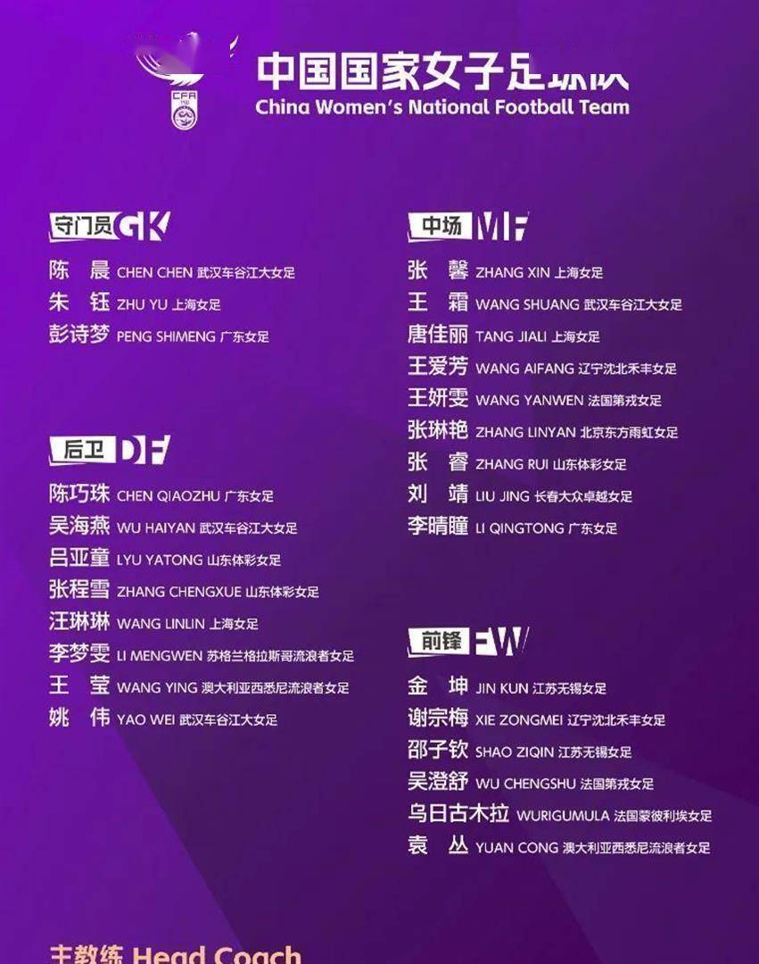 球队的阵容配置是本次出征的一大看点。2月19日,中国足协正式公布了26人的出征大名单。 名单由队长王霜、后防核心吴海燕以及进攻尖刀张琳艳领衔。 门将位置有陈晨、朱钰、彭诗梦三位经验丰富的球员。