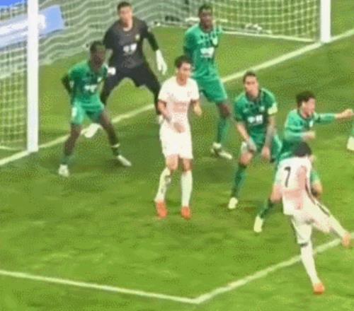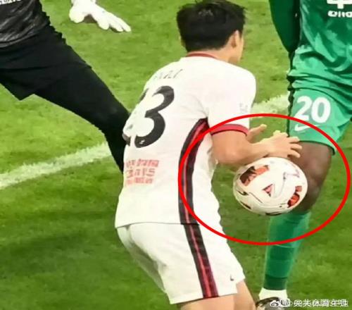 还有人给出更清晰的画面。从这图来看,皮球毫无疑问就是打到了廖力生的手臂上(下图),这已经是无可辩驳的了。现在的问题是,为何现场的VAR视频助理裁判没有发现这个问题?是现场的录像不清晰或角度不理想,还是裁判认为就算打手了也应该算进球呢?